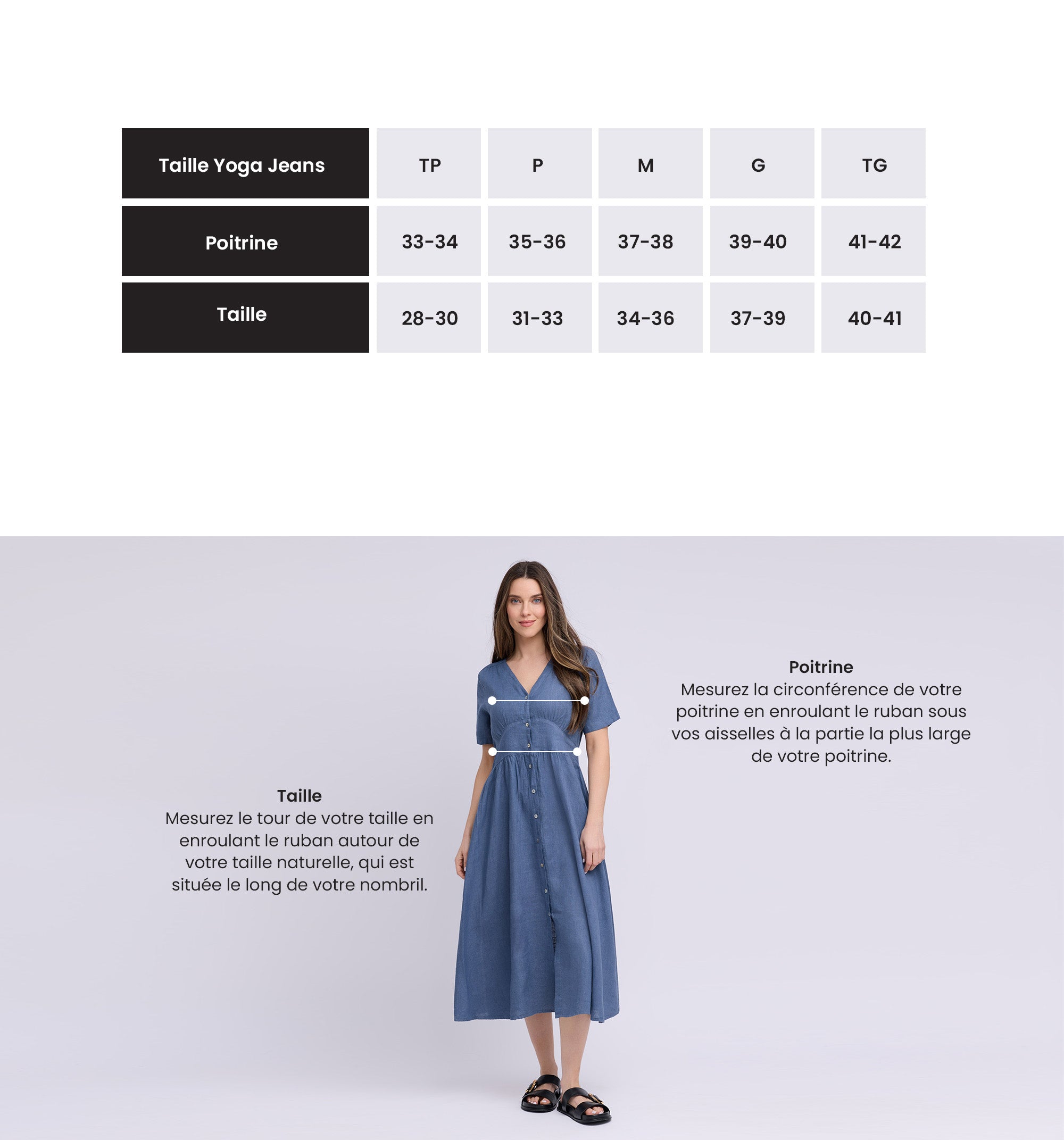 Si vous avez des questions, n'hésitez pas à nous contacter à Info@yogajeans.ca pour obtenir de l'aide. Veuillez vous référer à notre guide des tailles pour trouver la taille idéale.