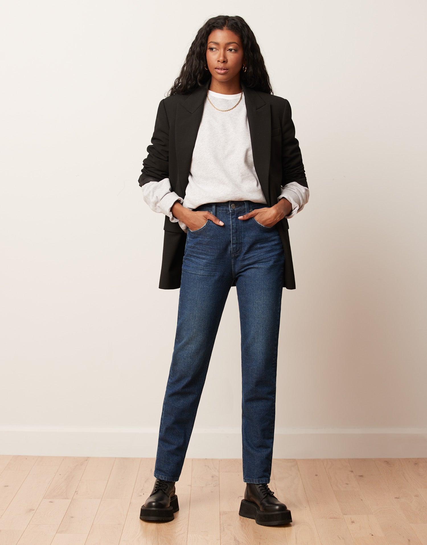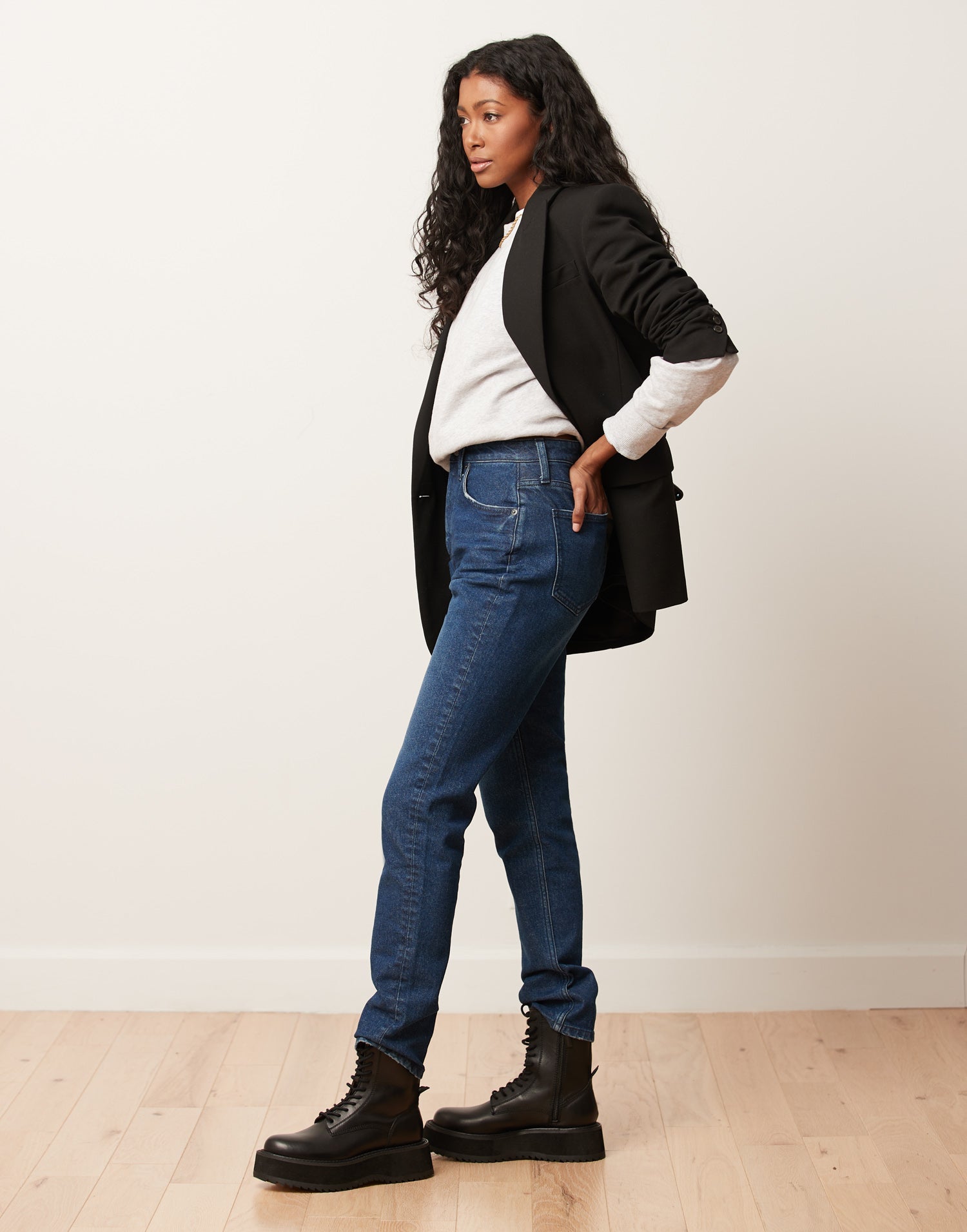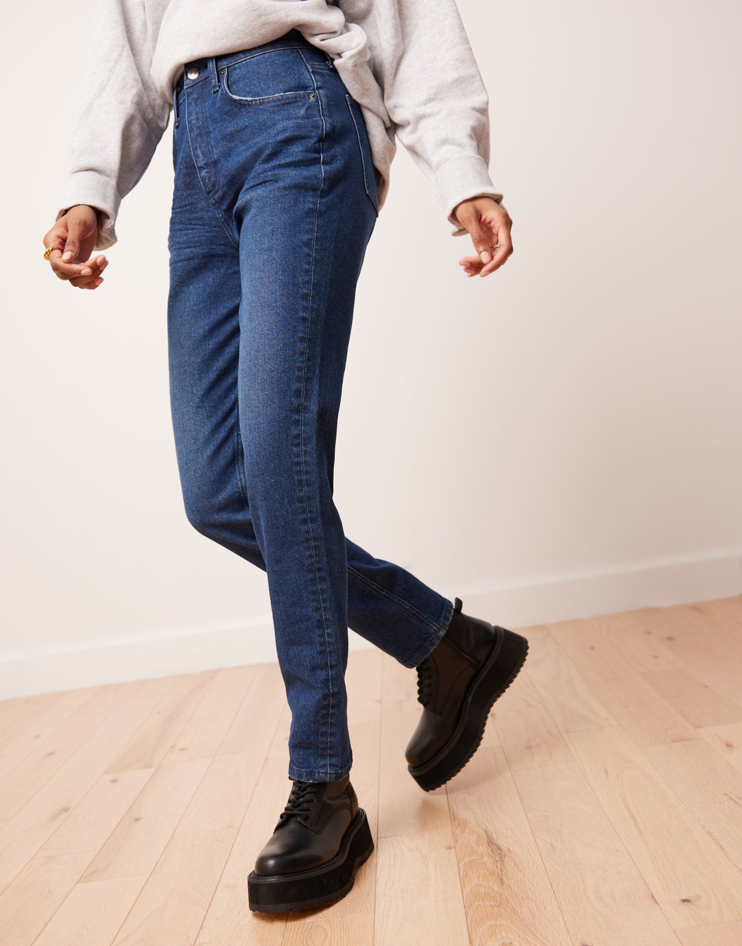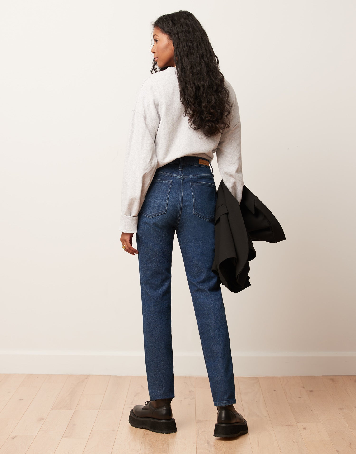 Ce jean taille haute bleu foncé présente un effet moustaches 3D sous les poches avant, une longueur d'e...