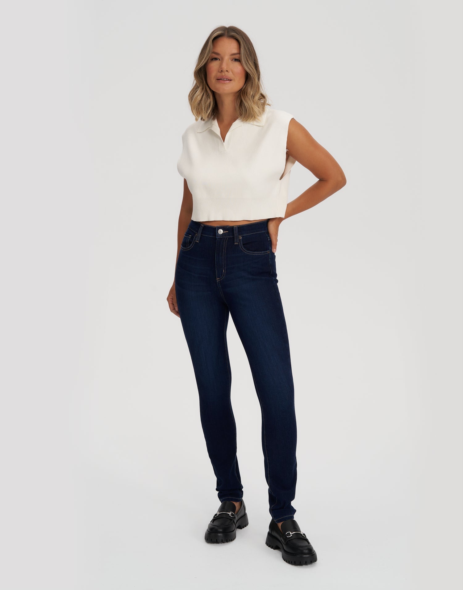 These high-rise skinny jeans are a dark indigo wash with subtle whiskers and a 30" inseam. They are the perfect balan...