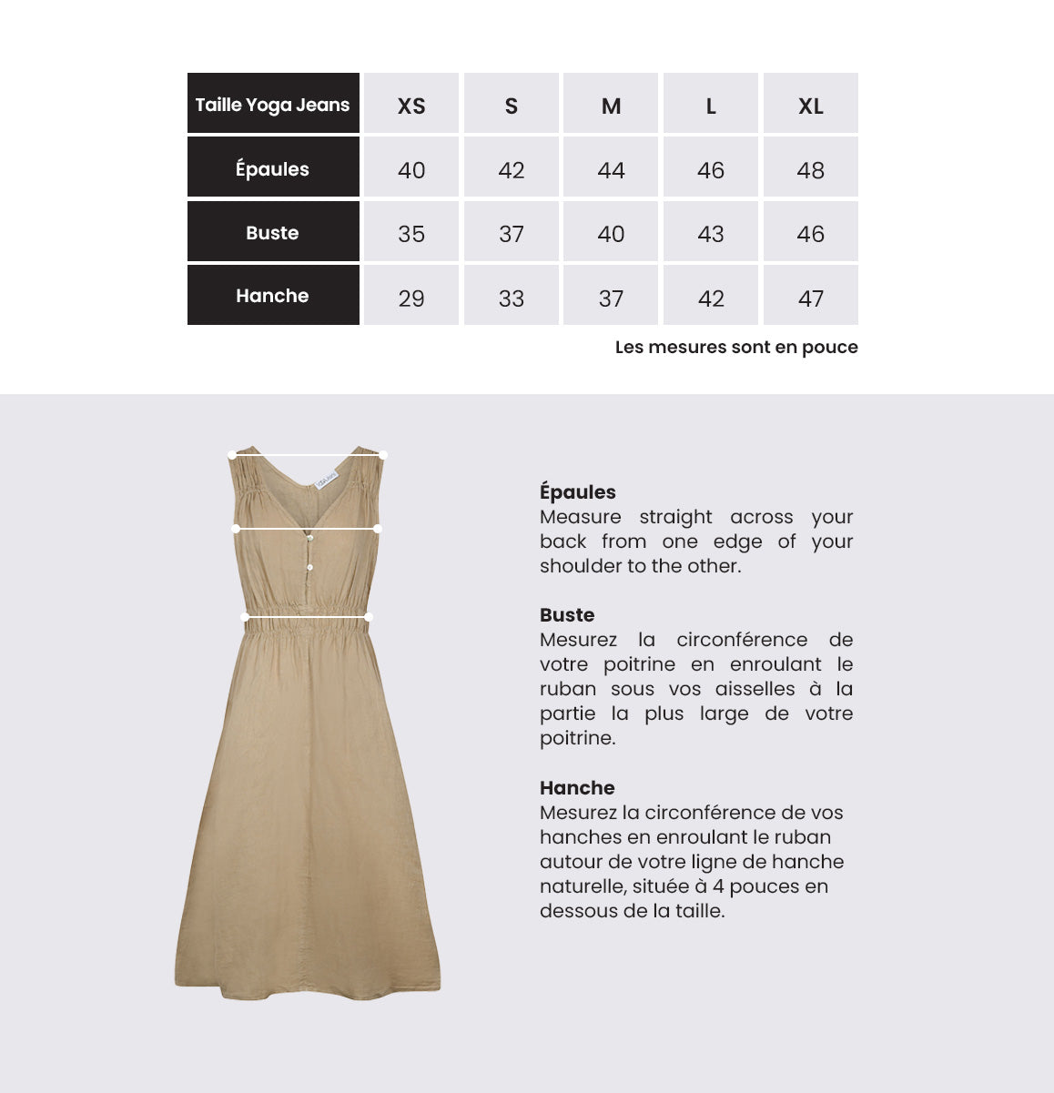 Si vous avez des questions, n'hésitez pas à nous contacter à Info@yogajeans.ca pour obtenir de l'aide. Veuillez vous référer à notre guide des tailles pour trouver la taille idéale.