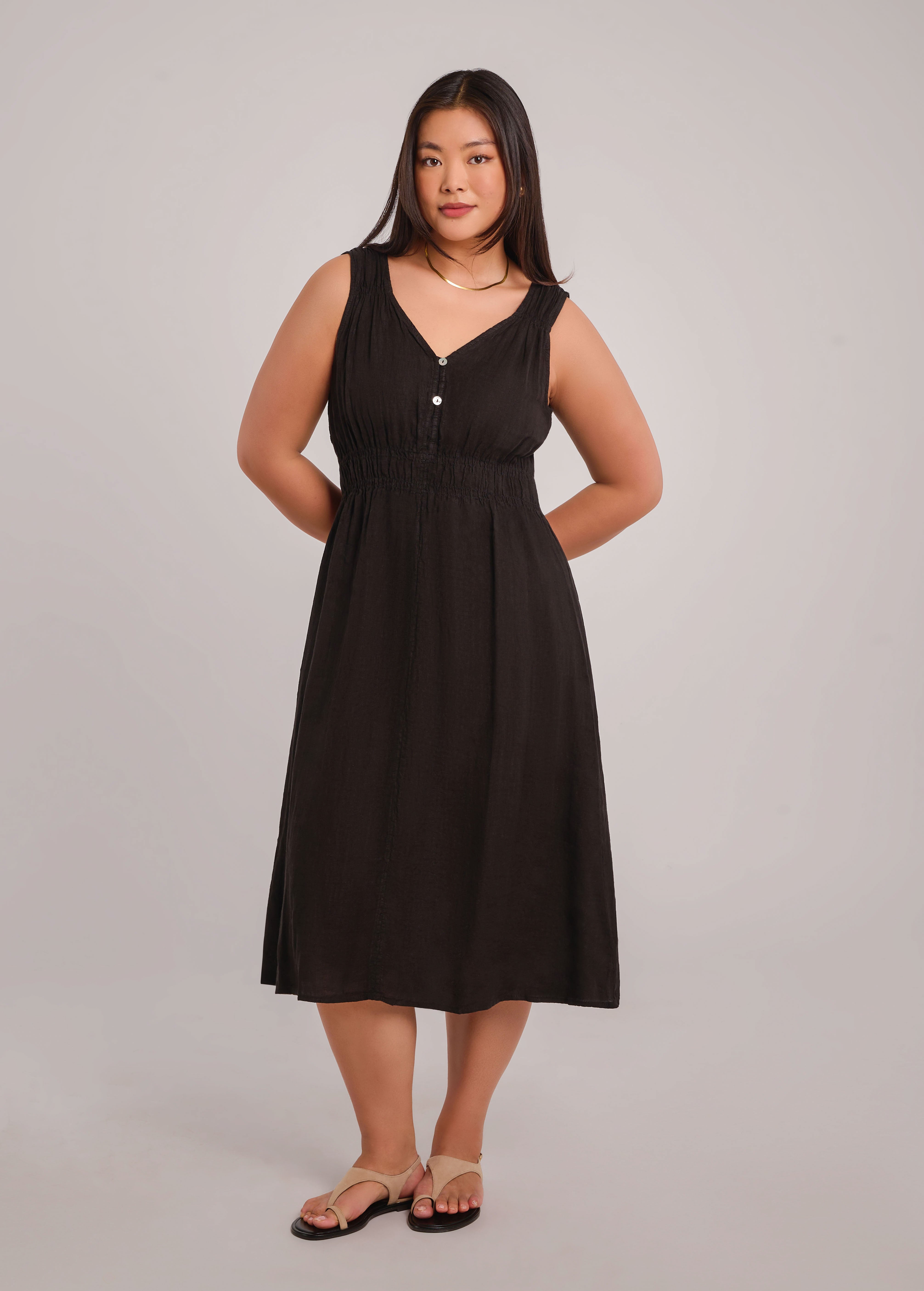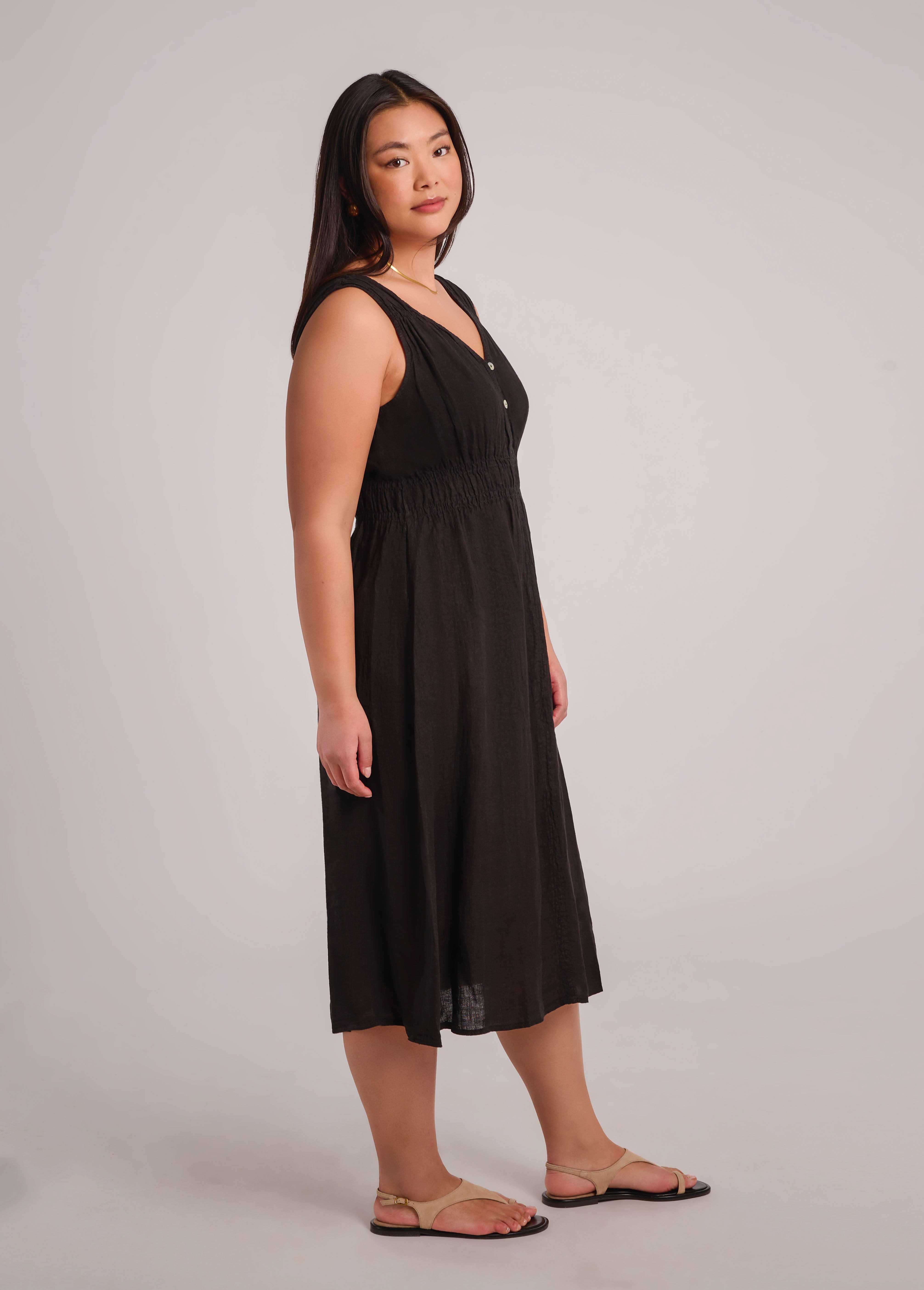 Découvrez Luna, notre superbe nouvelle robe midi ! Inspirés de notre populaire débardeur en lin à col en V, nous avons créé une robe à coupe droite avec un double détail froncé unique à la taille. Le devant de la robe présente deux boutons en nacre pour une touche d'élégance. Portez-le avec les boutons sur le devant pour un look classique, ou retournez-le pour un style différent. Le choix vous appartient !