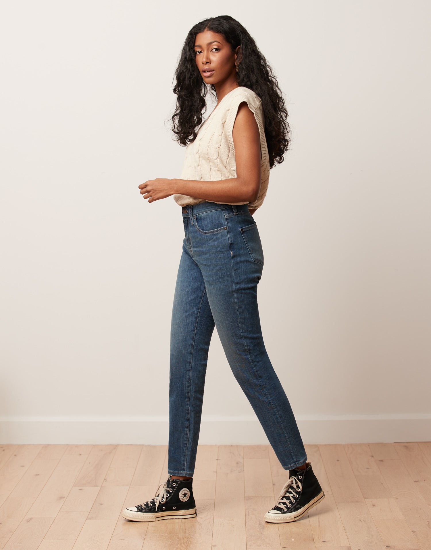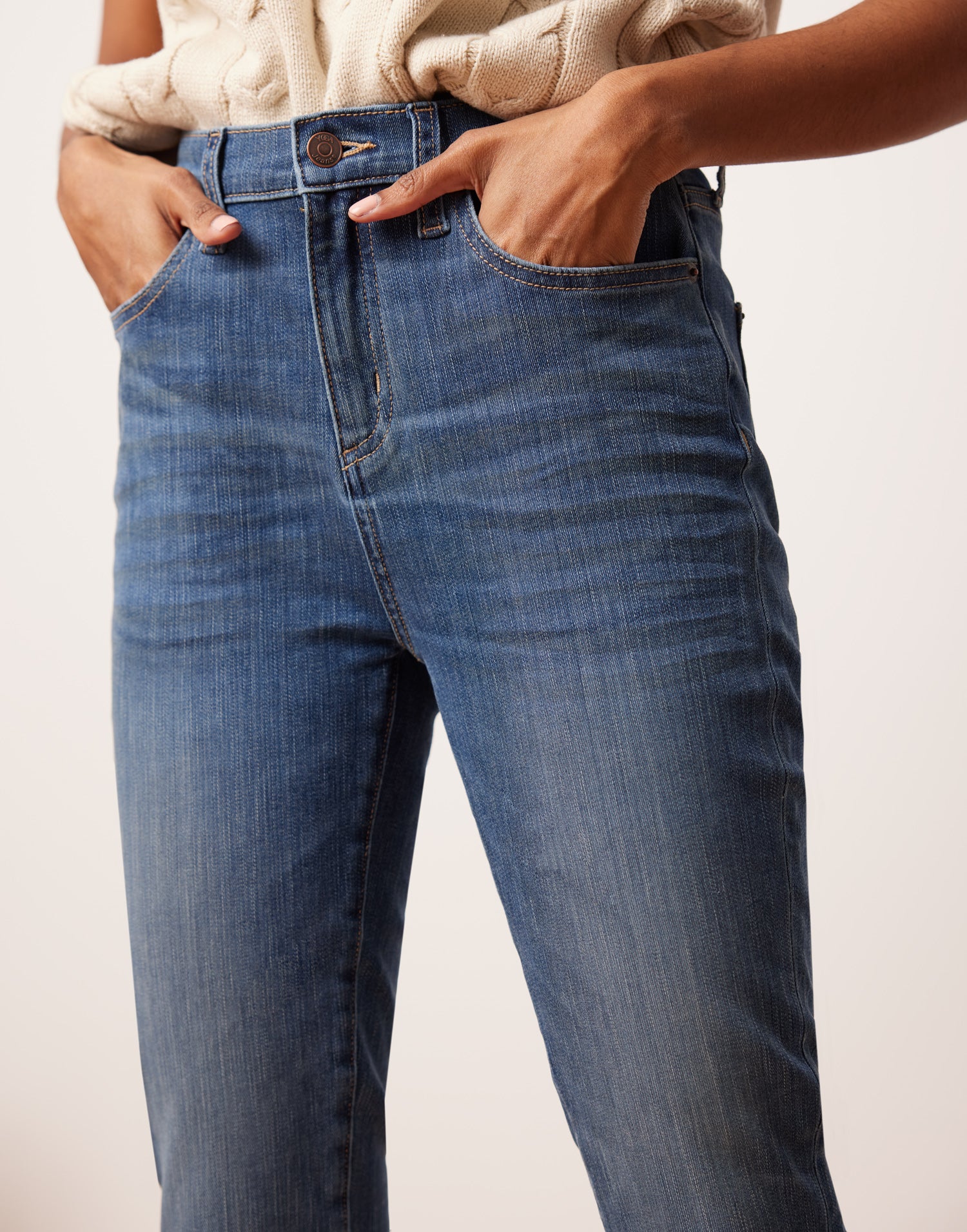 These high-rise skinny jeans are a casual medium blue wash with a 28" inseam.