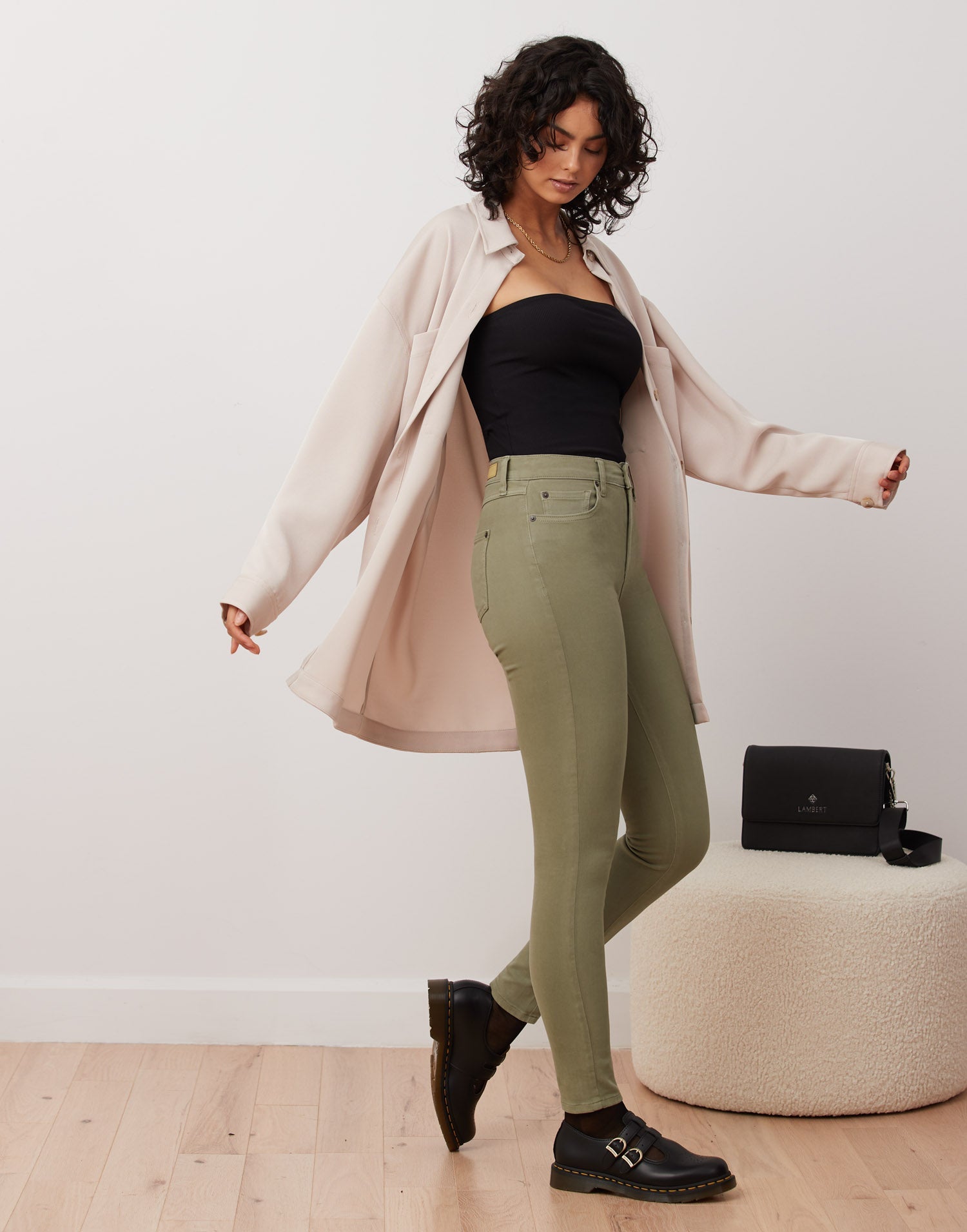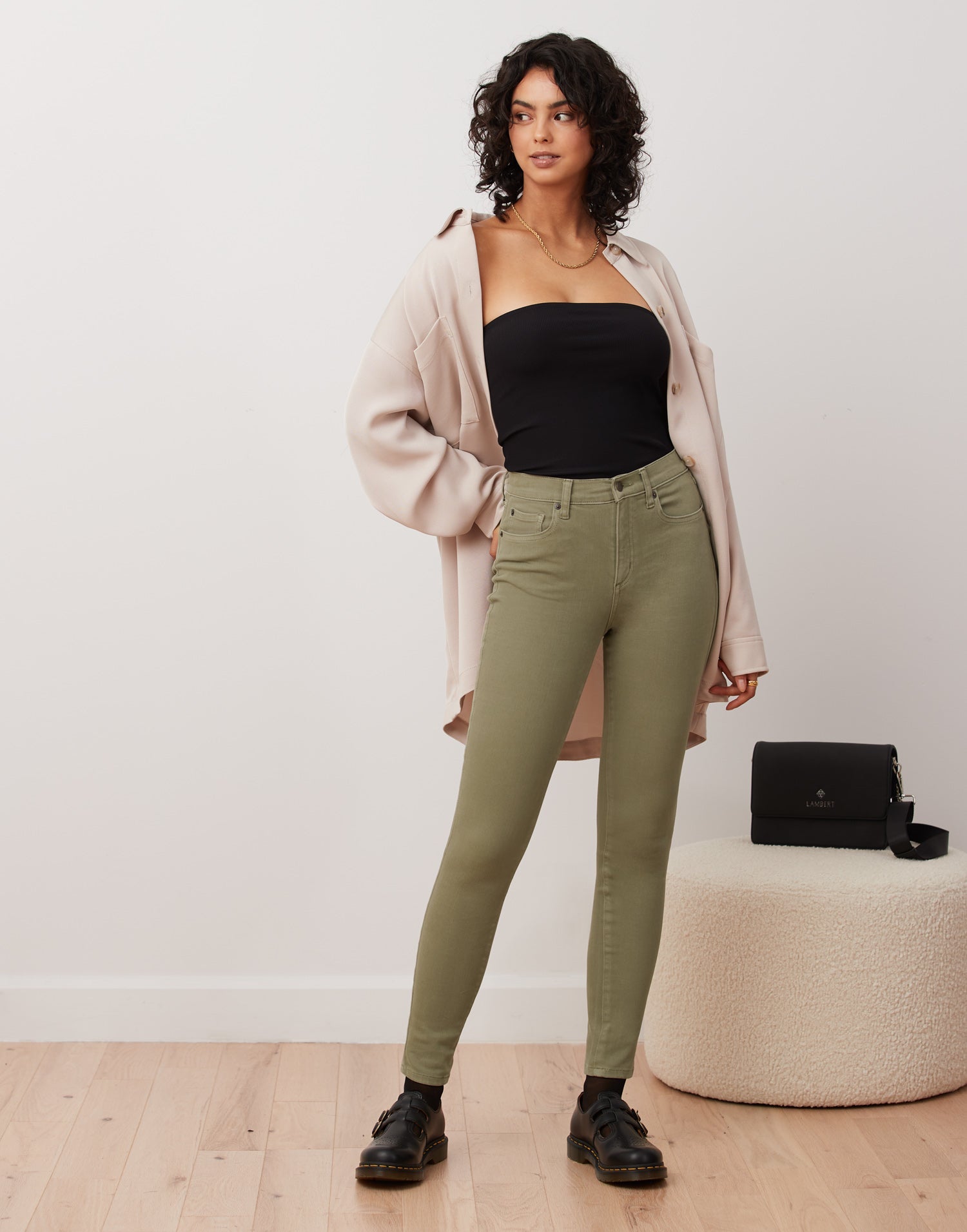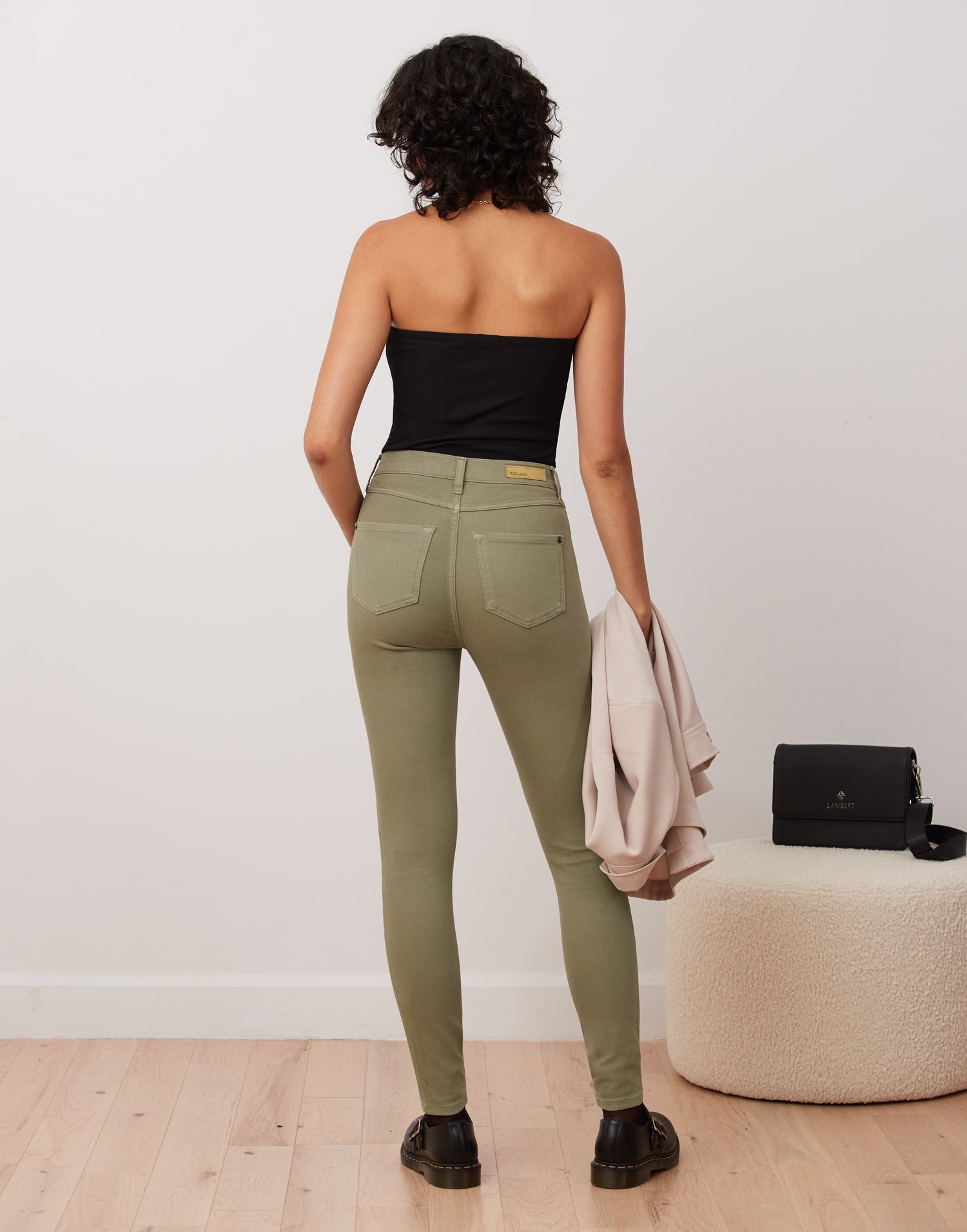 Rachel, notre jean skinny, est ajusté de la hanche à la cheville et épouse les formes pour allonger la silhouette et convenir à toutes les morphologies. Proposé en coloris Vetiver , ce jean taille classique est teint dans une douce nuance de vert sauge, pour une allure délicate et féminine. Il arrive à la cheville, possède une longueur d'entrejambe de 30" et des finitions impeccables.