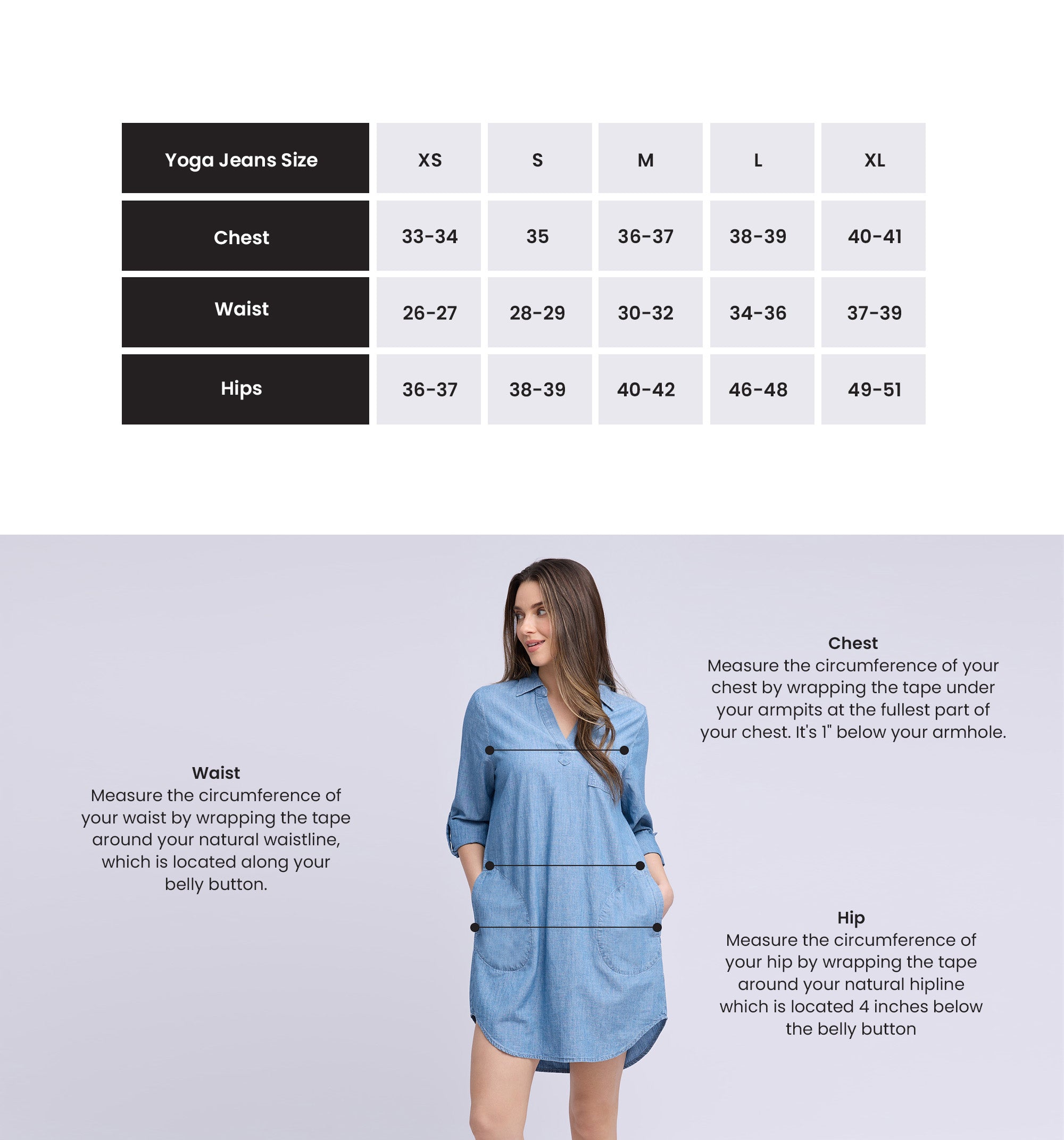 For any questions, feel free to contact us at Info@yogajeans.ca for a smoother, more confident shopping experience.Check our size chart to find your perfect fit.